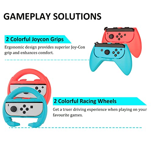 • Premium Accessories Kit: Carrying case, tempered glass screen protectors, protective case, racing wheels, Joy-Con grips, charging dock, playstand, game card case, joystick caps, and Joy-Con silicone cases.